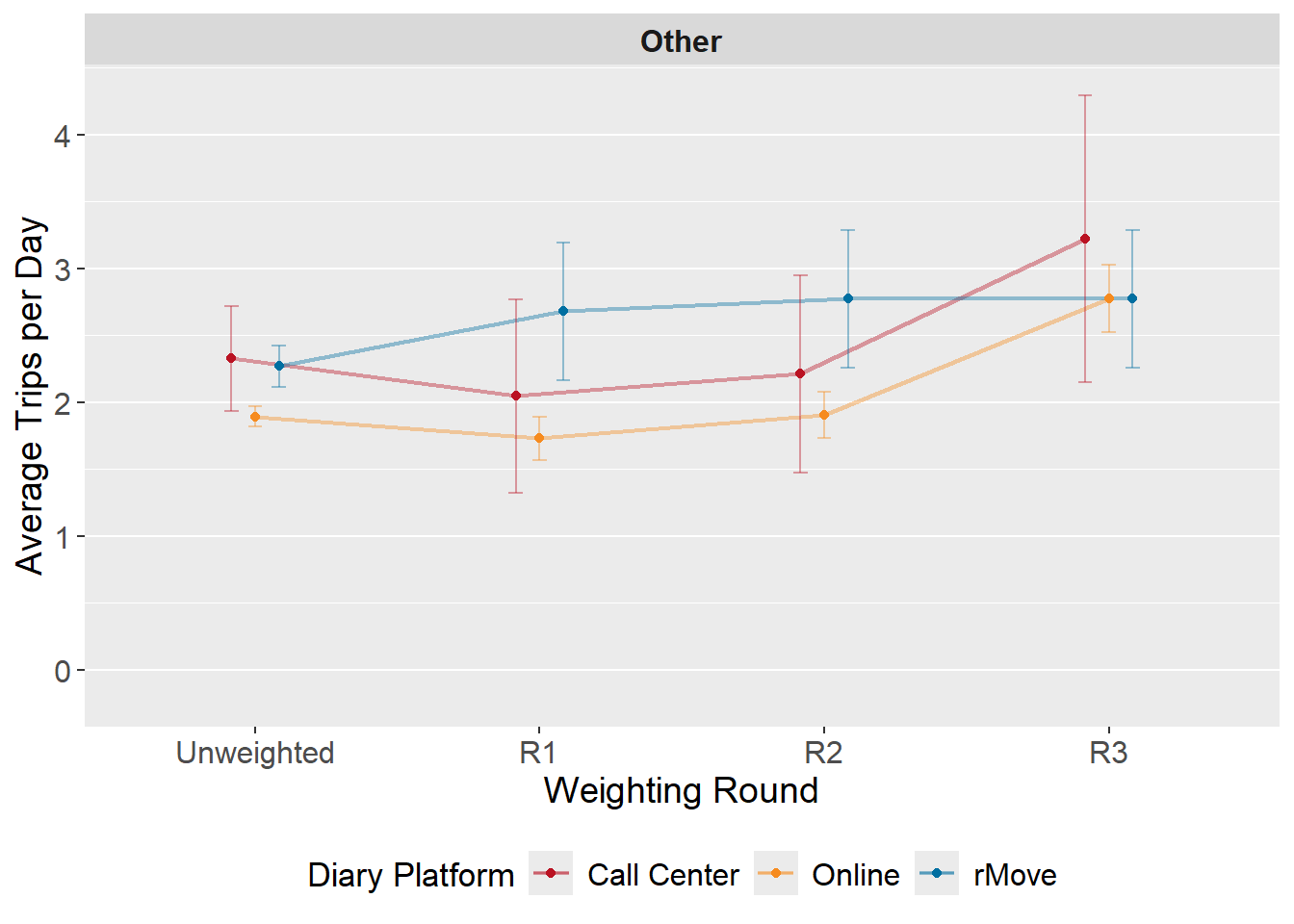 14.13.0.1 Figure: Average daily trip weight by weighting round and diary platform - Other trips