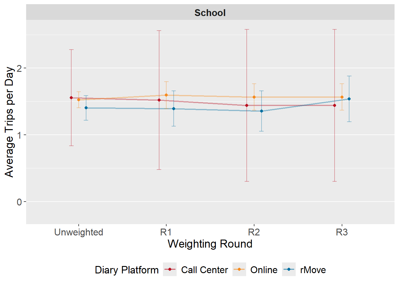 14.13.0.2 Figure: Average daily trip weight by weighting round and diary platform - School trips