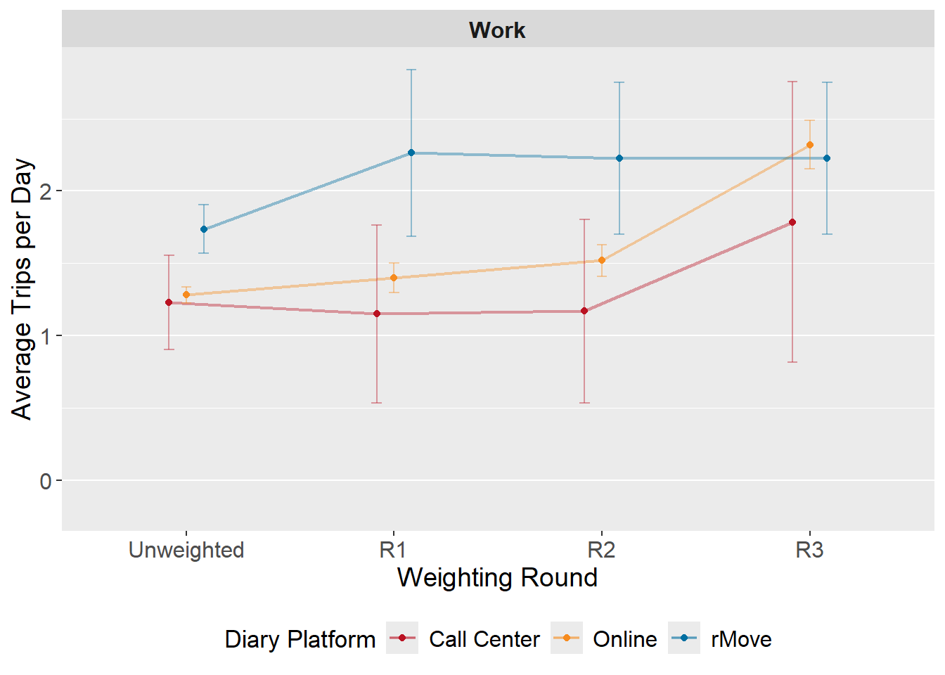The below figures summarize how reported trip rates evolve across weighting steps by diary platform. Average daily trip rates are calculated among only those persons eligible for that type of adjustment in Round 3 (i.e., work trip rates are calculated amongst those who are employed). This is done to assess the impact of Round 3 adjustment on trip rate results. Trip rates with large confidence intervals may represent combinations with small sample sizes and should be interpreted with caution.